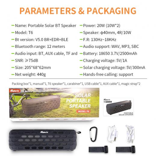 | 14. Laddningstid | 4h 15. Solar laddningsspänning: 5V300mA 16. Förpackningsstorlek: 25,6 * 7,3 * 8,3 cm 17. Produktvikt: 680g 18. Förpackningslista: högtalare * 1, karbinhake * 1, manuell * 1, laddningskabel * 1, ljudkabel * 1, magiskt band * 2 |