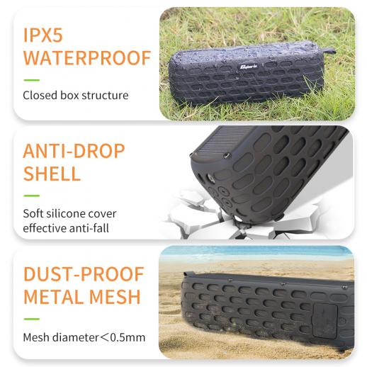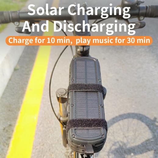 - * Denna Bluetooth-Bluetooth-högtalare använder en högpresterande monokristallin kisel ETFE-laminerad solpanel, som har överlägsen ljustransmission och absorberar solenergi snabbt. Var 10: e minut laddning i solen motsvarar en halvtimme musikuppspelningstid (Beroende på volymen musik som spelas och solljusets intensitet)