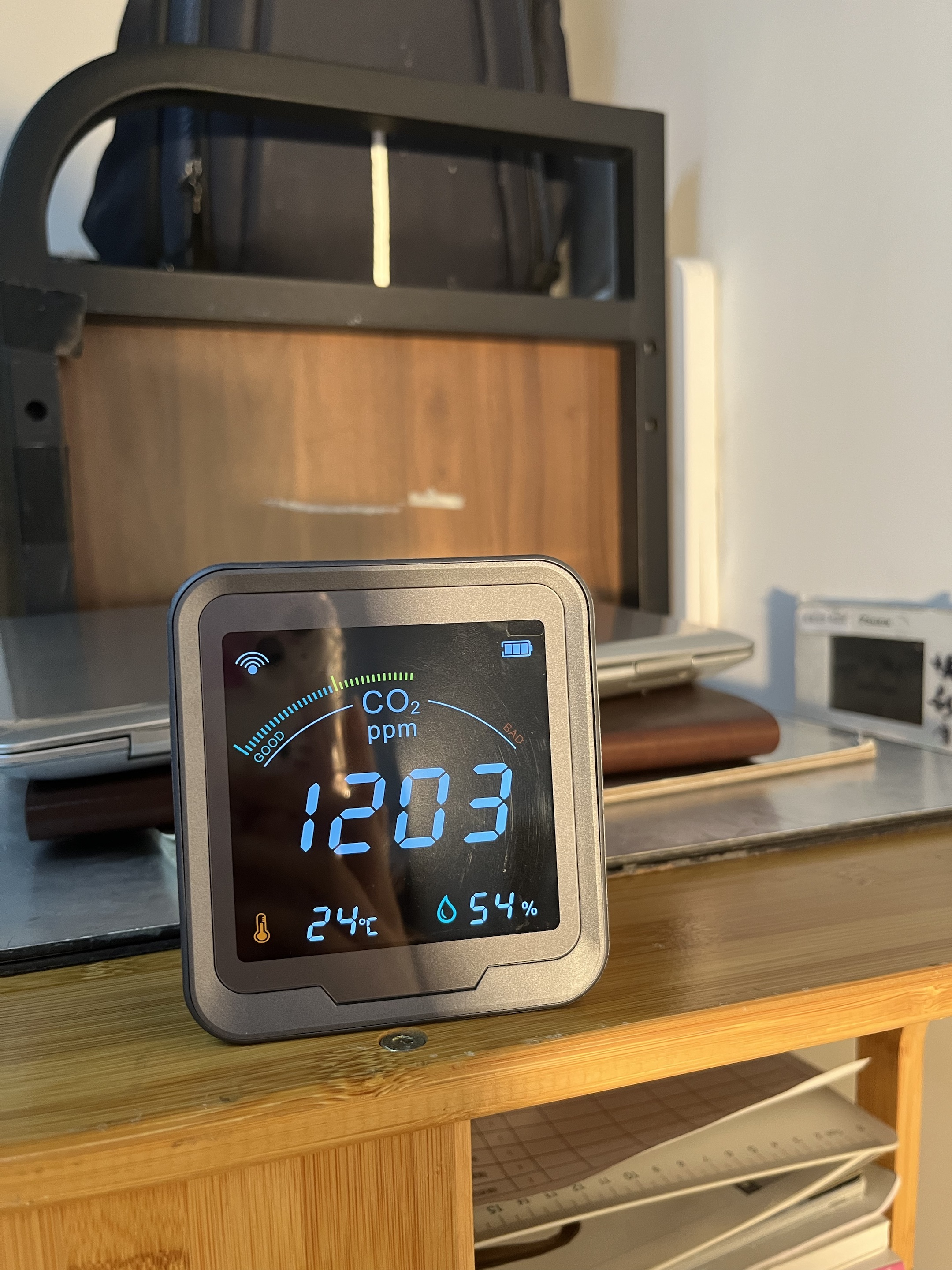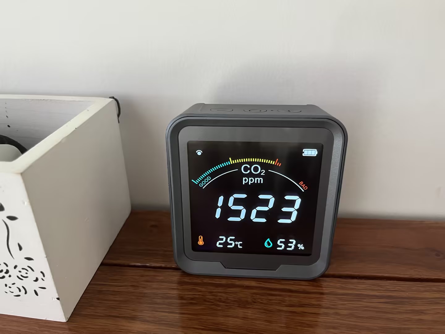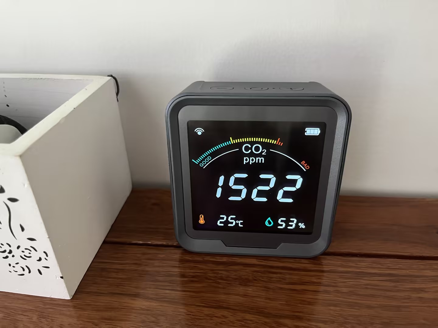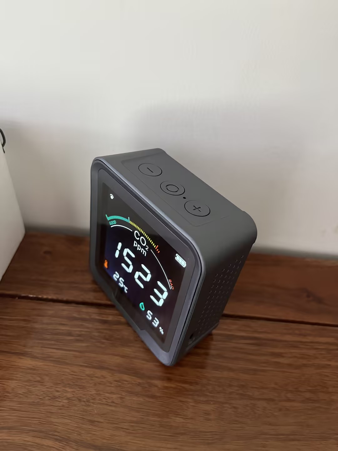 Köpte den här CO2-sensorn till mitt hus och den fungerar utmärkt. Skärmen är ljusstark och mycket lätt att förstå alla avläsningar. När CO2-nivån går upp, skulle jag slå på min luftrenare och jag kan se avläsningen sjunka. Detta är riktigt bra om du vill övervaka luftkvaliteten i ditt hus. Den har även temperatur- och fuktighetssensor. Wifi-funktionen är ett riktigt trevligt tillägg.