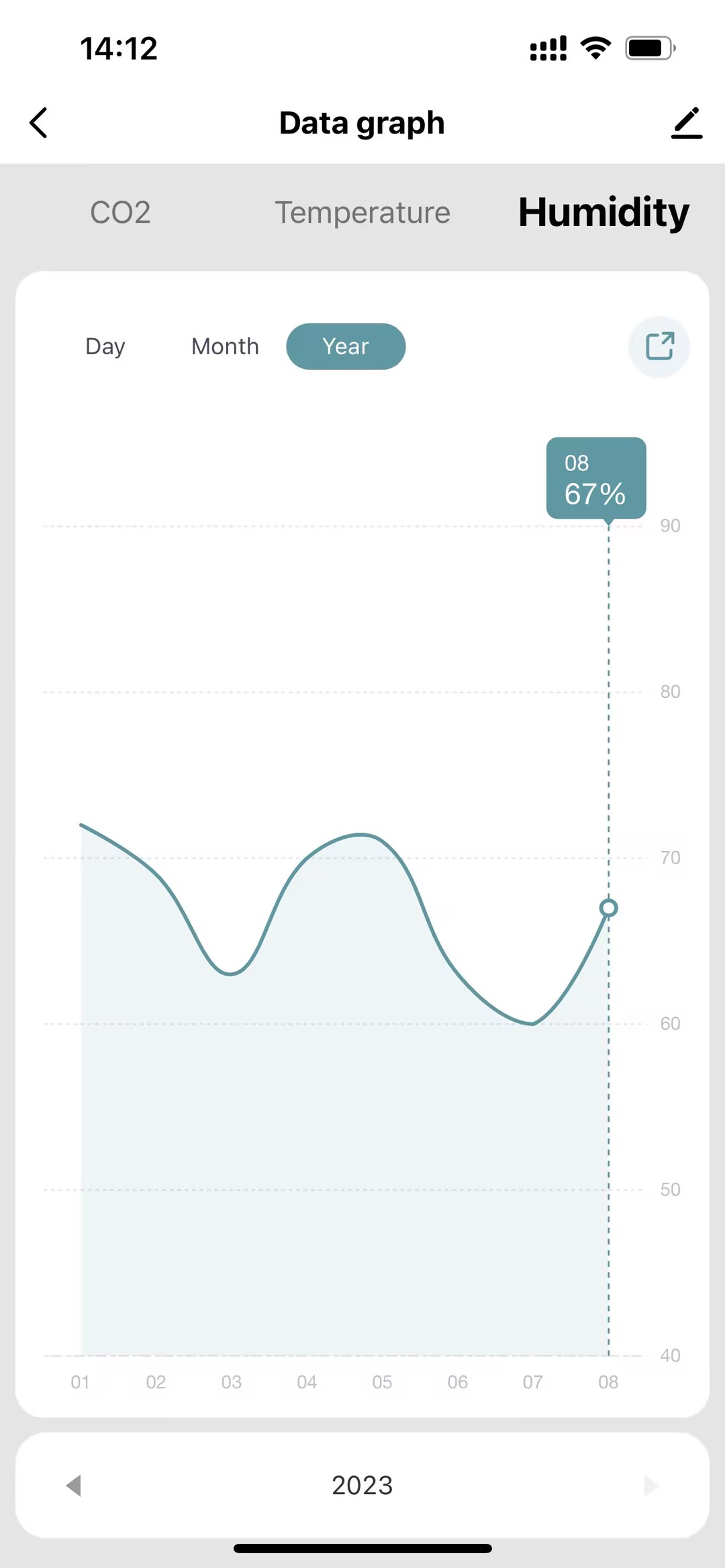 Grafisk visning av tidigare dataövergångar.För hantering av temperatur/luftfuktighet/CO2-koncentrationer.