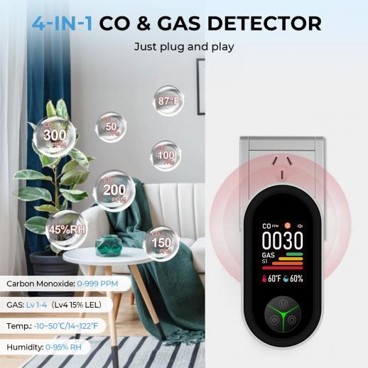 - Andas lugnt med dygnet runt-skydd! Denna 4-i-1-koldioxidgasdetektor övervakar kontinuerligt kolmonoxid, gasläckor, temperatur och luftfuktighet med hög noggrannhet. Dess färgkodade varningar (grön till röd) och 85 dB-larm varnar dig omedelbart för fara, medan den tydliga 2"-displayen håller dig informerad om specifika data. Bara att sätta i – ingen installation behövs! Förtroende för hem, hotell och kontor för pålitlig, bekymmersfri säkerhet.