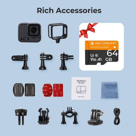 - * Enkel fotografering och delning – Granska och spela upp dina bilder direkt eller håll ett öga på dina handlingar med 2,1-tums IPS-skärm. Filöverföring är enkelt, anslut bara actionkameran till telefonen via det inbyggda WiFi, nu kan du helt styra kameran och dela dina spännande ögonblick utan att behöva ta bort microSD-kortet. Bonus! Ett 64Gb minneskort ingår!