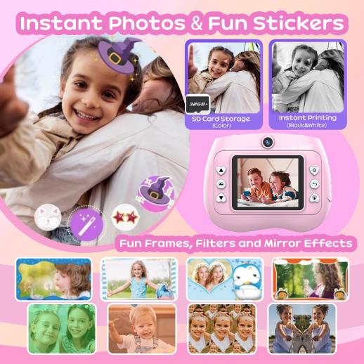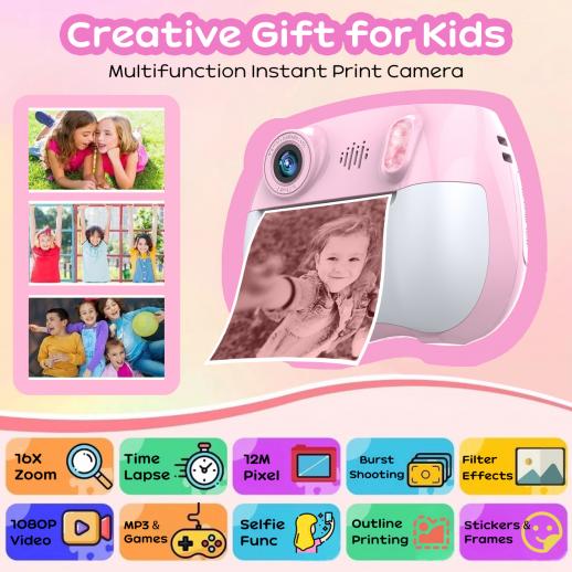 Kids Camera Instant Print Färgfoton, Fram- och Bakre Dual Selfie, 1080P HD Video för 3-12, Rosa, Kentfaith