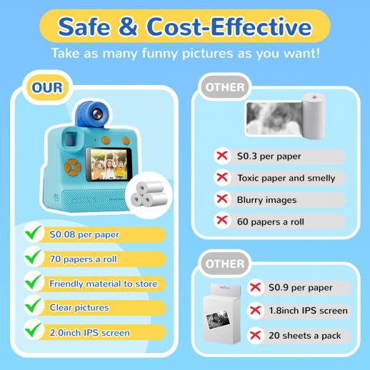 - * 【Säker utskriftspapper】Vår barnkamera använder 3-sekunders termisk utskrift för svartvita foton (barnen kan färglägga dem senare) utan kladdiga bläckpatroner. Leksakskameran innehåller 3 hudvänliga, enkla att byta ut pappersrullar (totalt 180 utskrifter), budgetvänlig jämfört med färgutskriftskameror—låt barnen skriva ut så många de vill!