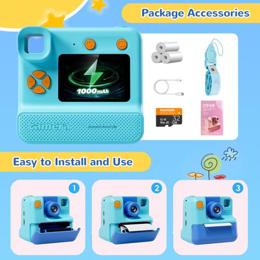 - * 【Creative Kids Camera Instant Print】Kentfaith Kids Instant Camera kan lagra färgfoton och snabbt skriva ut svartvita foton. Minikiten innehåller 3 rullar utskriftspapper, ett 32GB-kort, ett halsband och en USB Type-C-kabel. Barn i åldern 3 - 12 år kan använda den för att stimulera fantasi och kreativitet och DIY-bilder.