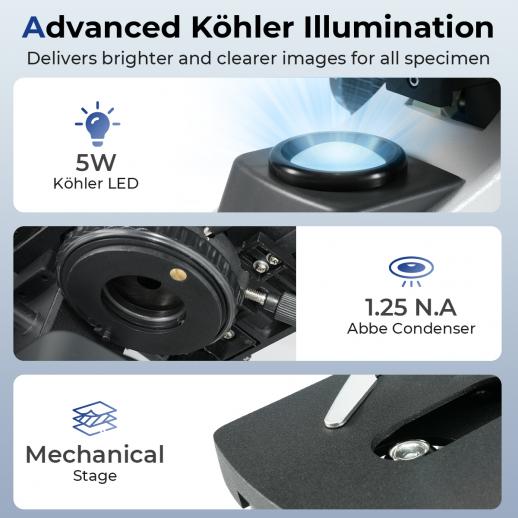 - * 【Ljusare och skarpare vy med 5W Koehler-belysning】 Till skillnad från andra kikaremikroskop som använder ett 1W LED-ljus, använder vårt ett Koehler-belysningssystem med 5W LED och en 1,25 N.A. Abbe-kondensor med irisbländare. Det ger ett jämnt, svalt och naturligt ljus över hela synfältet och ökar kontrasten mellan färgningsområden eller mellan vävnadsområden i dina sektioner.