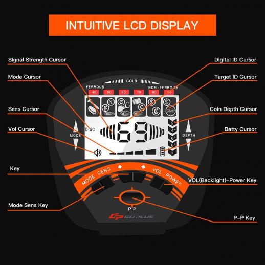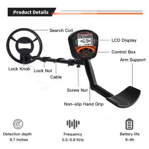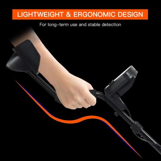 - * [Intuitiv LCD-skärm] Metalldetektorn är utrustad med en stor LCD-skärm med bakgrundsbelysning, så att du tydligt och bekvämt kan se detekteringsläget, känslighetsnivån, batteriets kondition och andra digitala bilder även i mörk miljö. När målmetallen detekteras ändras värdet på skärmen omedelbart, vilket gör det mer exakt och bekvämt;