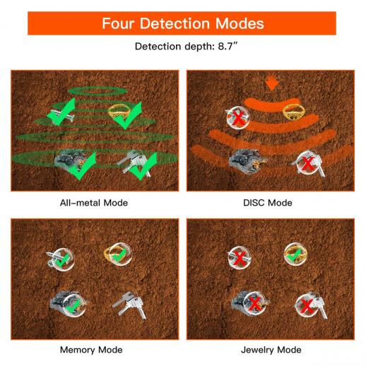 - * [4 driftlägen] Vår metalldetektor har fyra lägen, inklusive alla metalllägen, igenkänningslägen, minneslägen och smyckeslägen, som enkelt kan hitta olika metaller enligt dina olika behov. Dessutom kan tre unika ljudtoner enkelt identifiera metalltypen som ska detekteras, med ett maximalt detekteringsdjup på 8,7 tum;