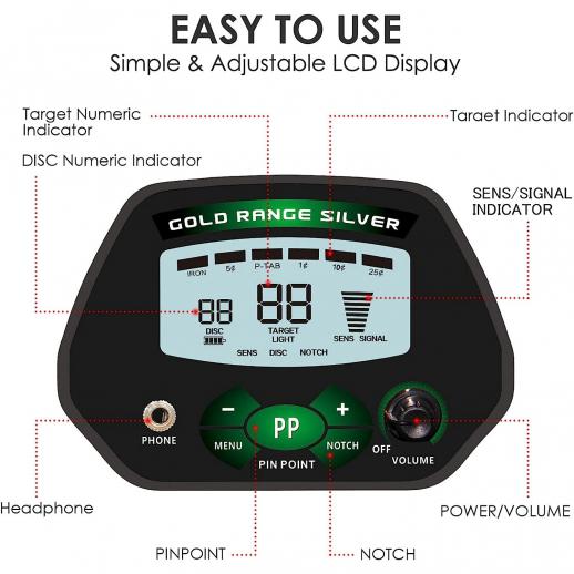 - * [LCD-skärm med bakgrundsbelysning] Metalldetektorns LCD-bakgrundsbelysningsskärm kan visa metalltypen, räckvidden för DISC och NOTCH, känslighetsnivån och batteriets tillstånd. Den har också en digital display av målet, så att du enkelt kan upptäcka olika skatter i alla miljöer, även under dagen eller natten i vattnet;