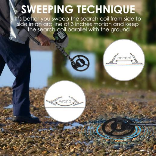 - * 【 Stor vattentät detektionsdisk 】 En 10 tums detektionsdisk med en vattentät klass IP68, med ett maximalt detekteringsdjup på 8,7 tum (för 25 cents mynt), som är djupare än andra vanliga detektorer och kan snabbt och exakt lokalisera målets position. (Anm.: Kontrollboxen är inte vattentät);