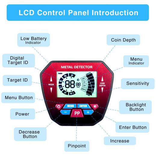 - * Stor LCD-skärm: Metalldetektorn har en tydlig stor LCD-skärm, vilket gör att du kan få detekteringsdynamiken när som helst. Du kan se metalltyp, måldjup, känslighetsnivå, batteritillstånd och volymnivå, vilket är mer exakt och bekvämt. Den levereras också med en digital skärm för mål-ID, så att du kan söka bättre med bakgrundsbelysning även i mörka områden;