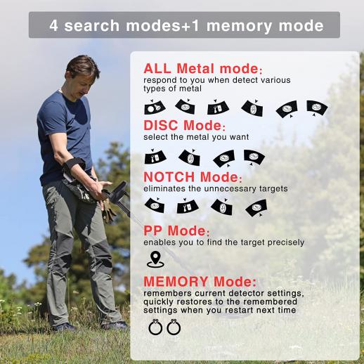 - * Professionell metalldetektor: Metalldetektor är en professionell skattjägare, som ger fyra söklägen, inklusive alla metallläge, igenkänningsläge, hakläge, exakt positioneringsläge och minnesläge. Den innovativa minnesfunktionen kan komma ihåg metallen i den senaste detektorn och den specifika typen kan detekteras nästa gång den slås på. (Obs: Detektorn kommer ihåg att ställa in innan strömmen stängs av);