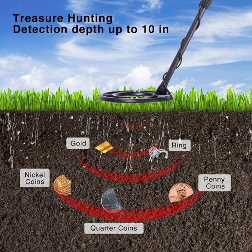 - * 10 tums vattentät detektionsplatta: Den 10 tums breda detektionsplattan har hög känslighet och kraftfull igenkänningsförmåga, vilket gör det enkelt att lokalisera metall på ett djup av 10 tum under jorden. Dessutom har denna metalldetektor en IP68 vattentät detektionsplatta, som gör att du kan arbeta bra i grunt vatten och är mycket lämplig för utomhusskattjakt, såsom stränder och strömmar. (Obs: Kontrollboxen är inte vattentät)