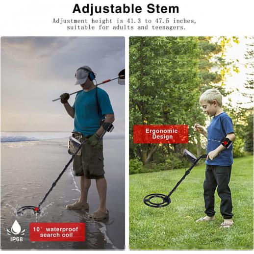 - * Justerbar ventilstam och ergonomisk design: Metalldetektorn är utrustad med 41,3 tum till 47,5 tum justerbar och infällbar ventilstam, som är lämplig för vuxna i olika höjder såväl som barn. Dessutom har detektorn en ergonomisk design, inklusive justerbara armstöd och halkskydd handtag, vilket gör det bekvämare för dig att söka efter skatter;