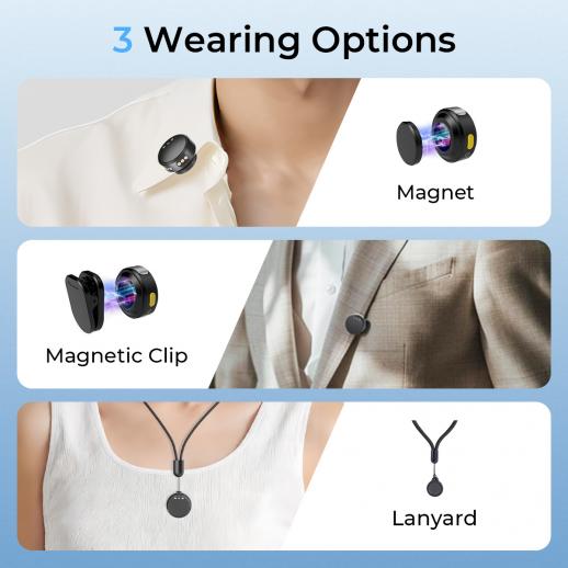 Med 2 magnetklämmor, 2 magneter och en snodd, befriar vår trådlösa mini mikrofon dig från att hålla en mikrofon i handflatan hela tiden. Det ger tre olika sätt att bära. Du kan klippa eller montera mikrofonen praktiskt taget var som helst, oavsett om det är din skjorta, ficka, hatt eller hår. Eller så kan du prova det coola nya "halsbandet". Den starka magneten ser till att den sitter säkert fast på dina kläder utan att hänga eller hänga.
