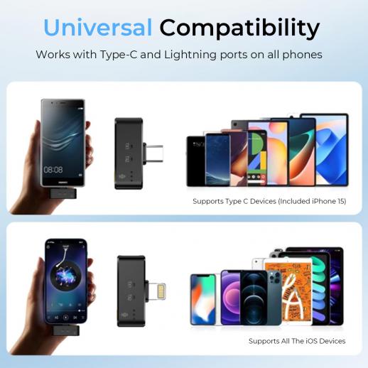 Inklusive en blixtmottagare och en typ-c mottagare, vilket gör den kompatibel med vanliga iOS/Android smartphones, surfplattor och bärbara datorer. Typ-c-kontakten är också kompatibel med iPhone 15-serien och senare versioner.