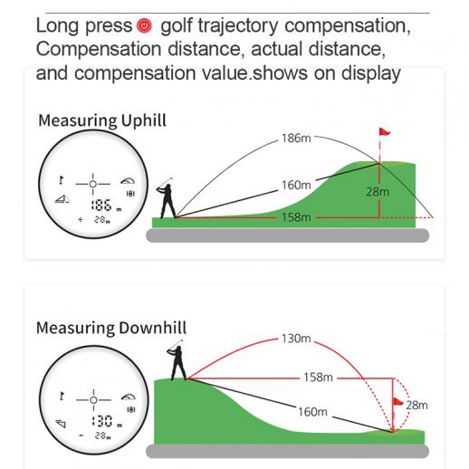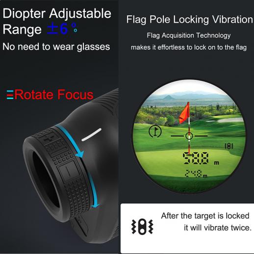 - * 【Precis lutning och flagglås】 I sluttningskompensationsläge, använd avstånd och vinkel för att generera exakta beräkningar och hjälpa dig att fatta rätt beslut, vilket ger dig det verkliga avståndet mellan dig och ditt mål. Med flagglåsningsteknik och pulsvibration skickar den ut en kort vibrationspuls för att bekräfta att du har låst fast vid ditt mål.