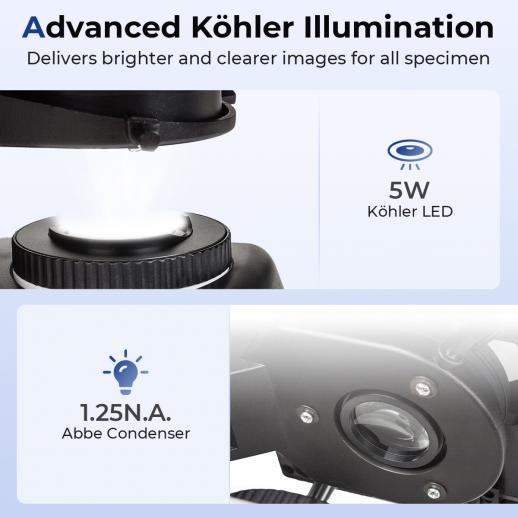 - * 【Skarpare Kontrast med 5W Köhler-belysning】Utrustad med ett kraftfullt 5W Köhler LED-system (jämfört med det vanliga 3W), levererar detta laboratoriemikroskop ljus, jämn och naturlig belysning. Den 1,25 NA Abbe-kondensatorn med irisbländare och oberoende lyftkontroll låter dig finjustera ljusintensiteten (0–100%) och fokus, vilket ger tydligare kontrast och förbättrad synlighet för färgade områden och vävnadssektioner.