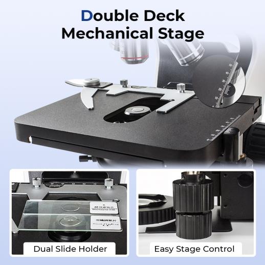 - * 【Dubbelskikts mekaniska stativ & enkel fokusering】Det dubbelskikts mekaniska stativet med dubbla skjutfästen håller dina prover stabila och låter dig jämföra sida vid sida med lätthet. Stativen erbjuder ett smidigt, precist XY-rörelsområde på 75mm × 52mm med en noggrannhet på 1,0mm. Grov- och finfokuseringsrattar är separerade för bättre kontroll, så du kan snabbt få skarp fokus, även på de minsta detaljerna.