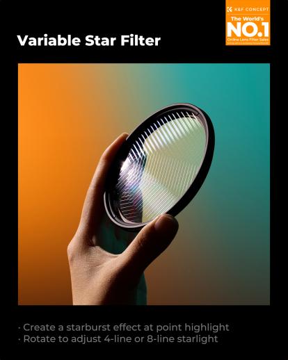- * 【Gratis växling mellan 4-punkts- och 8-punktsstjärna】 För att erbjuda ultimat bekvämlighet när du använder detta stjärnfilter lägger K&F Concept de mest använda stjärneffekterna i ett filter. Du kan rotera filtret för att smidigt växla mellan 4-punkts- och 8-punktsstjärna. Baserat på fotograferingsförhållandena och kreativa preferenser tillåts exakta och konstnärliga kompositioner med detta filter monterat på din kameralins.