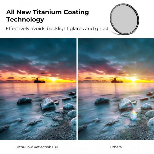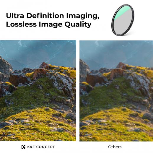 - * 【0,1 % ultralåg reflektivitet】 Filterreflektiviteten för ultralåg reflektion kontrolleras till 0,1 %, vilket effektivt minskar linsreflektion och halofenomen, vilket resulterar i en tydligare bild, högre kontrast och rikare detaljer. K&F Concepts cirkulära polarisatorfilter med ultralåg reflektivitet eliminerar 99,9 % av polariserat ljus och har en hög transmittans på 45 %.