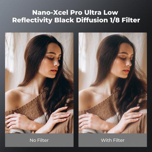 - * 【Ultralåg reflektans】Nano-X PRO black diffusion 1/8-filtret har en beläggning med ultralåg reflektans med endast 0,15 % reflektans, vilket effektivt minimerar spökbilder från starka ljuskällor i natt- eller dagscener. Detta black diffusion 1/8-filter säkerställer tydligare bilder med naturlig dimeffekt, perfekt för bilder med filmiska effekter.