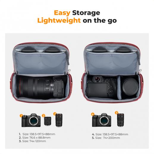 Dessa väskor är perfekta när du reser lätt. Jag får enkelt plats med en Sony A7C eller Canon R8 med ett extra objektiv och några små tillbehör som några trådlösa mikrofoner eller ett extra batteri. Materialet är fint och det ser bra ut också. Dessutom har dragkedjorna och klämmorna en mer exklusiv känsla. Rekommenderas starkt.