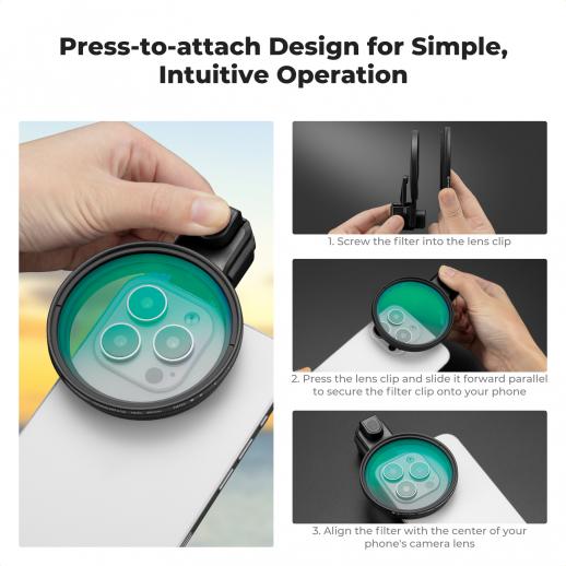 - * 【Variabelt ND2-32-filter】Detta variabla ND2-32-filter är ett oumbärligt tillbehör för telefonfotografering och fungerar som sömlösa solglasögon för ditt telefonobjektiv. Det minskar inkommande ljus med 1 till 5 steg, vilket ger dig flexibel exponeringskontroll över olika ljusförhållanden.