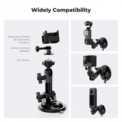 - * [Justerbar med 3 leder och snabb installation] Detta kamerafäste med sugkopp har 3 justerbara leder utformade för bättre flexibilitet och möjliggör enkel justering av enheten i idealisk position. Design med ett knapptryck för snabb borttagning och installation av sugkoppen för att förbättra fotograferingseffektiviteten.