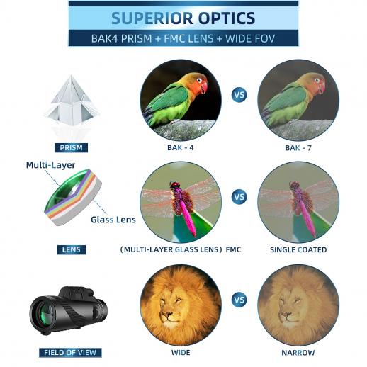 - * Helt belagd FMC-lins, bra bildåtergivning, klarare, ljusgenomsläpplighet upp till 99,5 %. Utrustad med högkvalitativt BAK4-prisma, som effektivt kan undvika vinjettering och säkerställa ljus och skarp bild;