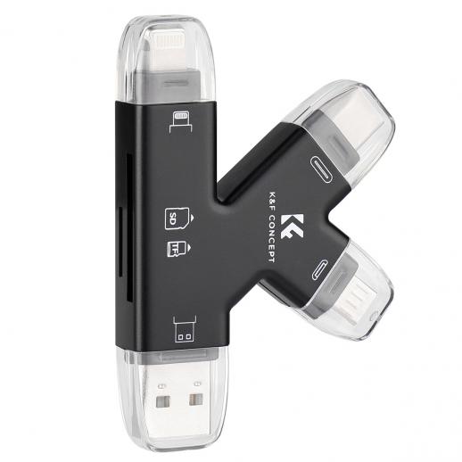 - * 4 i 1 SD-kortläsare: Minneskortläsaren har olika gränssnitt, USB/USB Type-C/Micro USB/SD-kortplats/Micro SD-kortplats och iOS-enhetsladdningsport för iPhone/iPad, så att du kan Önskade filer kan lätt överföras mellan olika enheter.