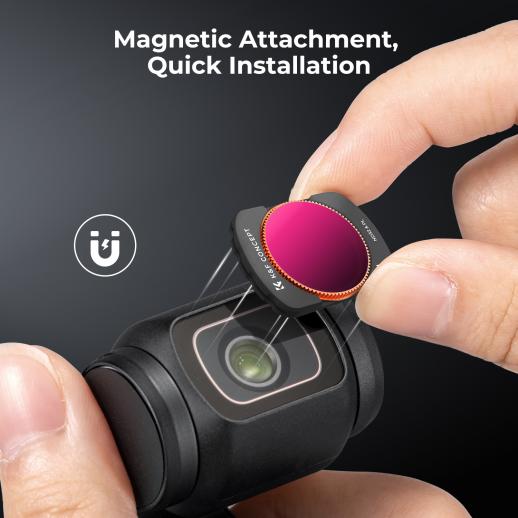 - * 【Magnetisk design för snabbväxling】 Med K&F Concepts magnetiska snabbväxlingsdesign kan ND-filtren fästas på actionkameralinsen snabbt och smidigt. Eftersom de är extremt tunna och lätta, påverkar inte varje filter gimbalen när den är fäst.