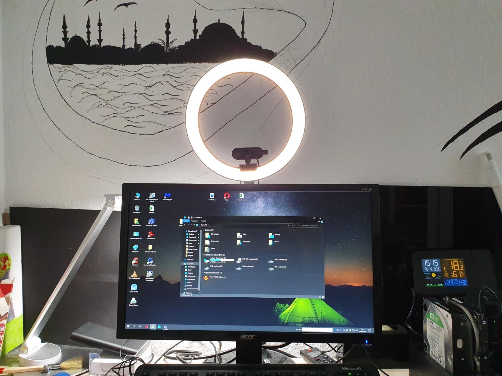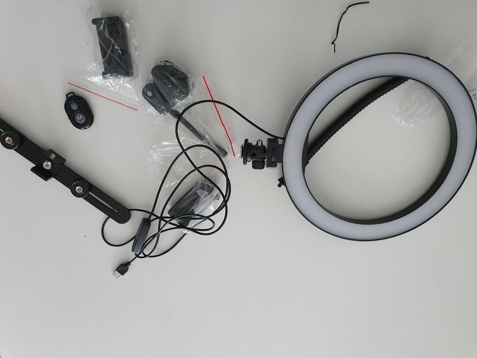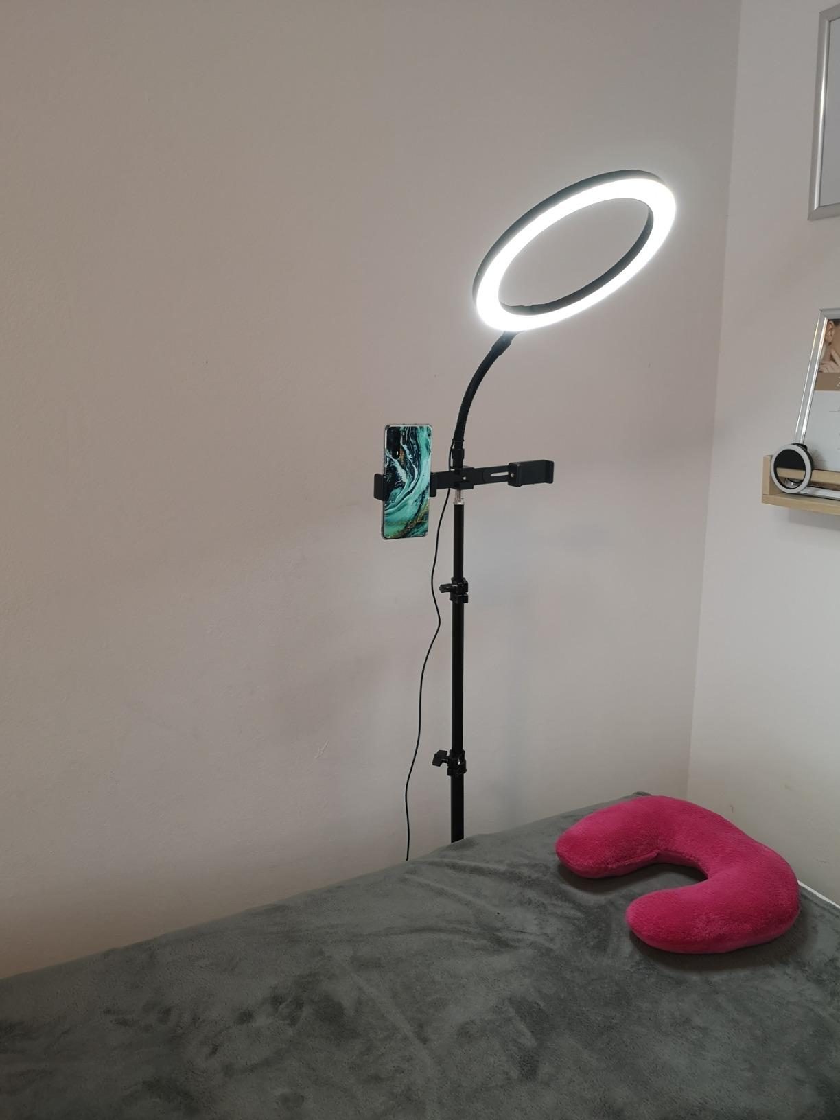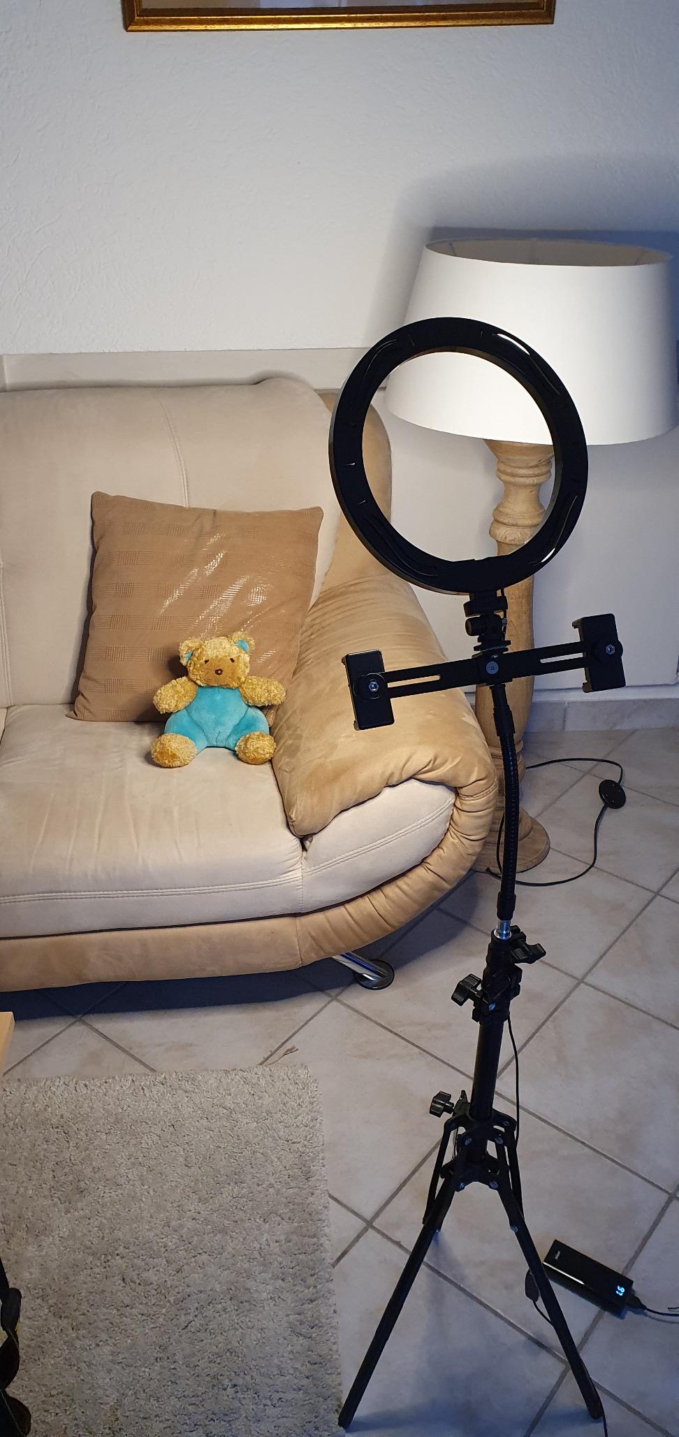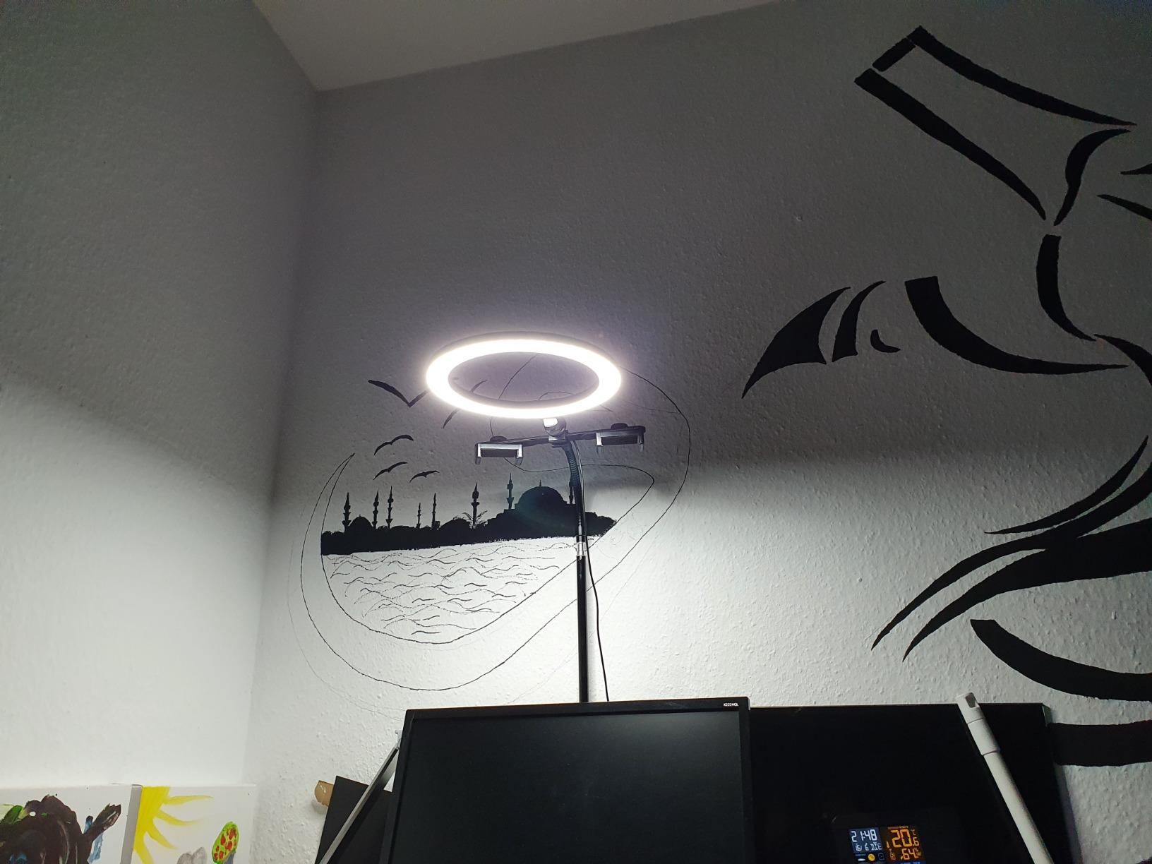 Wenn ich abends mal meinen Homeoffice Tätigkeiten nachgehen und dabei die cam an habe oder Schreibkram erledige, hat mir lange Zeit "etwas" gefehlt. Undzwar das richtige Licht!Lieferumfang :Geliefert wird das Licht mit einem Stativ, ausgefahren ist es inklusive dem ringlicht über 2 Meter hoch. Was für mich sehr gut ist, da man es im oberen Bereich beliebig verbiegen kann und es von oben auf die meine Arbeitsblätter strahlt.Zwei Smartphonehakterungen, eine Mikrofonhalterung and eine Bluetooth Fernbedienung.Funktion :Das zusammenbauen geht hat recht fix ca. drehen und wenden. Der Ein-Ausschalter ist beleuchtet, was abends sehr hilfreich ist. 3 Optionen hat man als Lichtmodus zur Auswahl-kalt-warm-beides zusammenDazu kann man es auch heller oder dunkler stellen. Es ist wirklich sehr hell. Mit der cam aufs Gesicht geleuchtet, bei voller Helligkeit bekomme ich kaum die Augen geöffnet und dazu noch recht sparsamDas Kabel har en USB Anschluss och kan dementsprechend mit nahezu allen Ladegeräten betrieben werden